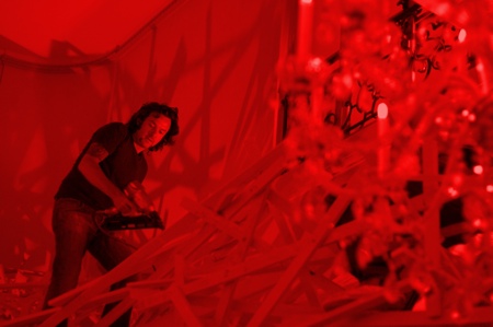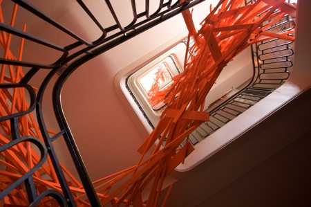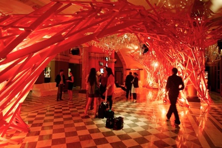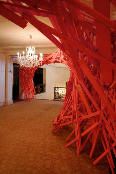 Гости приглашенные на это мероприятие наблюдали удивительную деревянную экспозицию ввиде нескончаемого ярко-красного потока, проникающего с улицы в холл, по коридорам и лестницам снизу вверх через все здание.